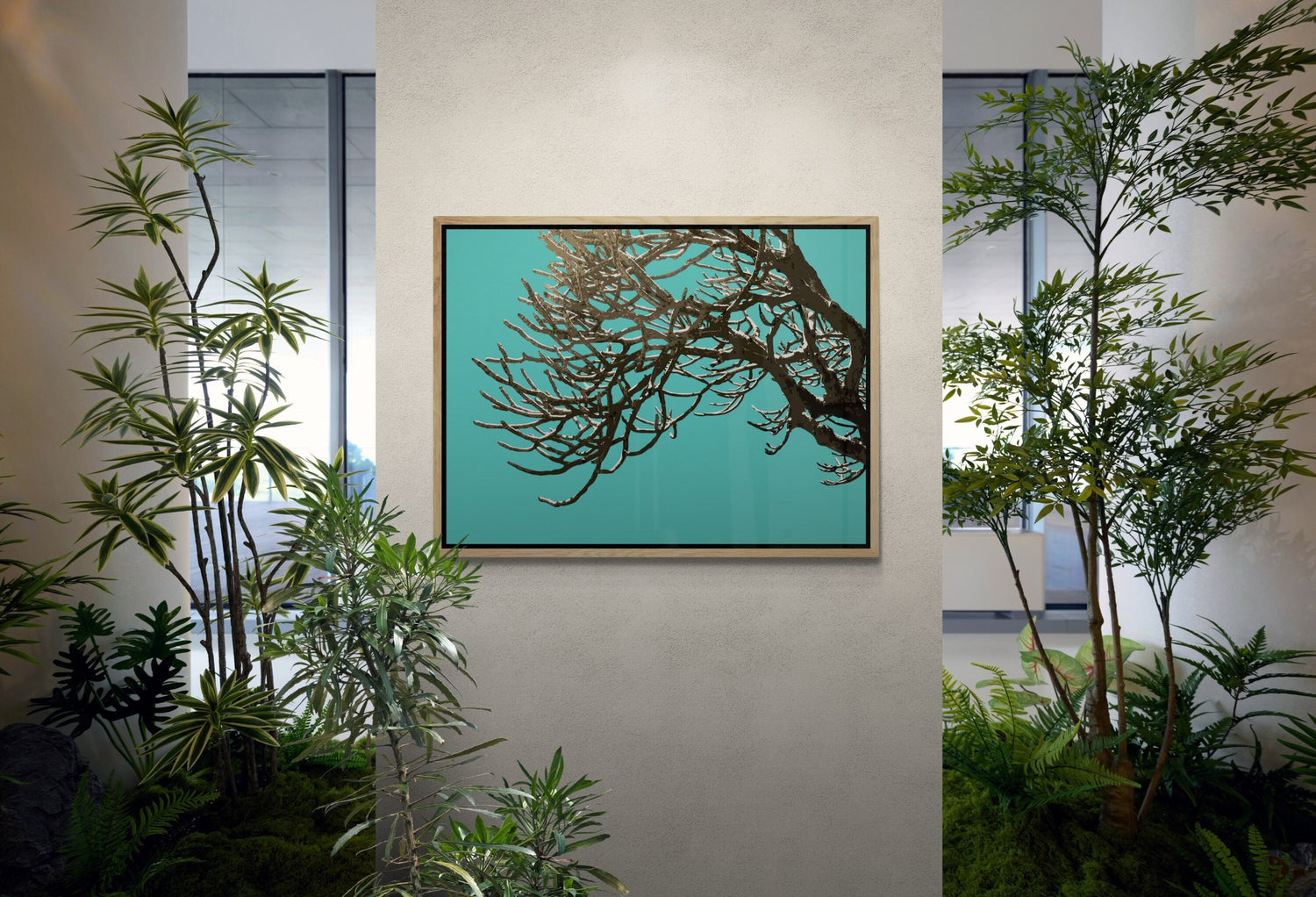 The bare winter branches of the frangipani become a web of mystery and light. Limbs twist and fracture into a labyrinth of form—at once stark and lyrical—etched against bold fields of colour that shift mood with each palette. Eight colour themes available.